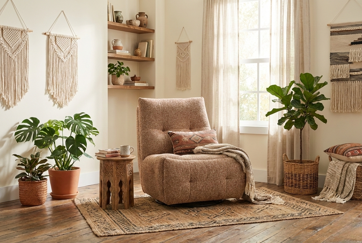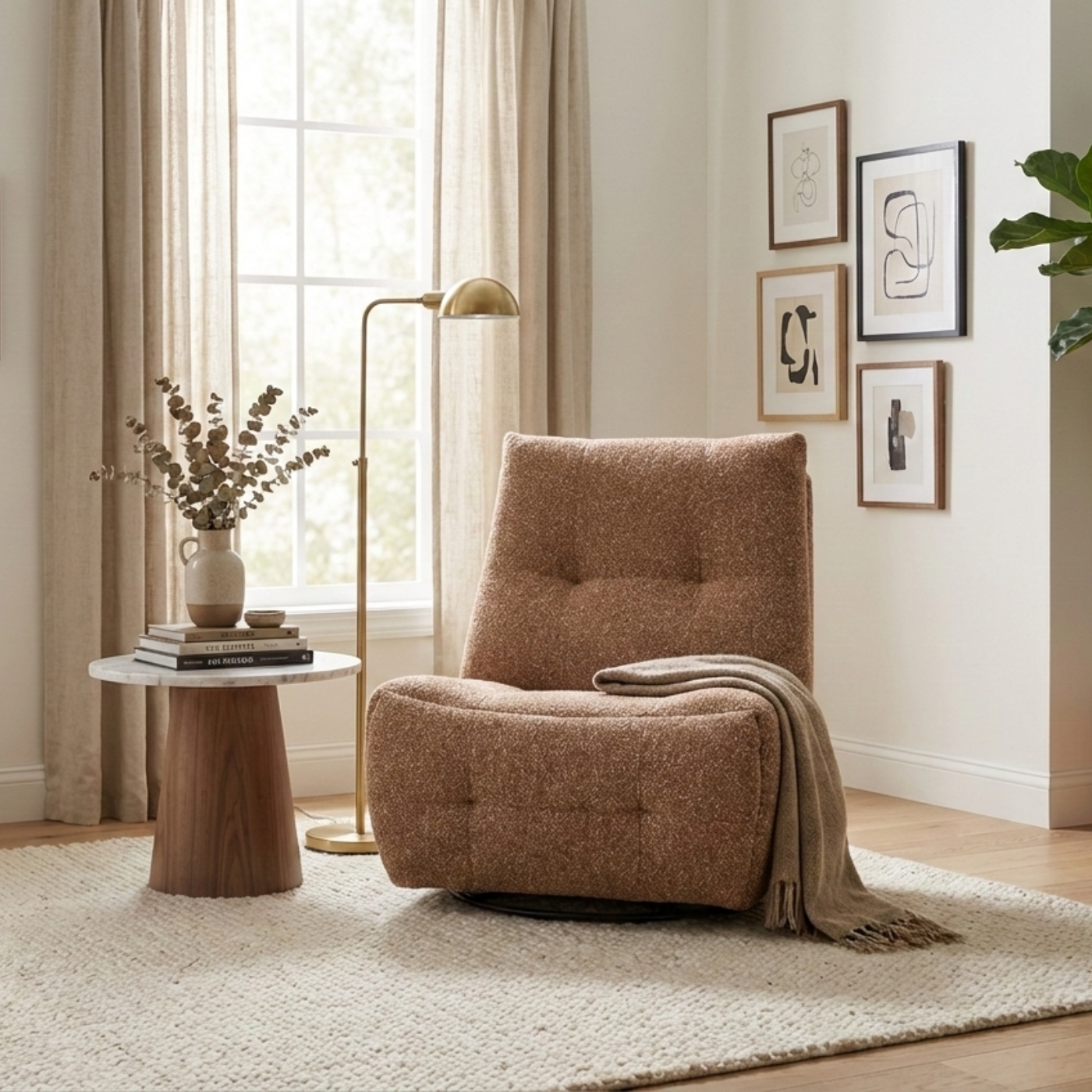 • מנגנון 3 ב-1: הכורסה משלבת תנועת נדנוד חלקה ומרגיעה, אפשרות סיבוב של 360 מעלות, ומצב הטיה (Recliner) למנוחה מלאה.