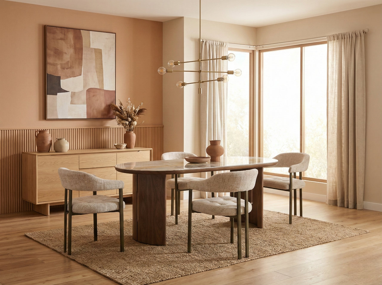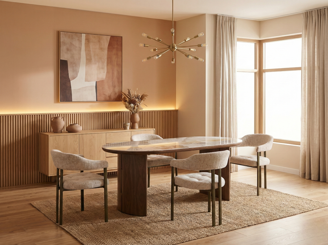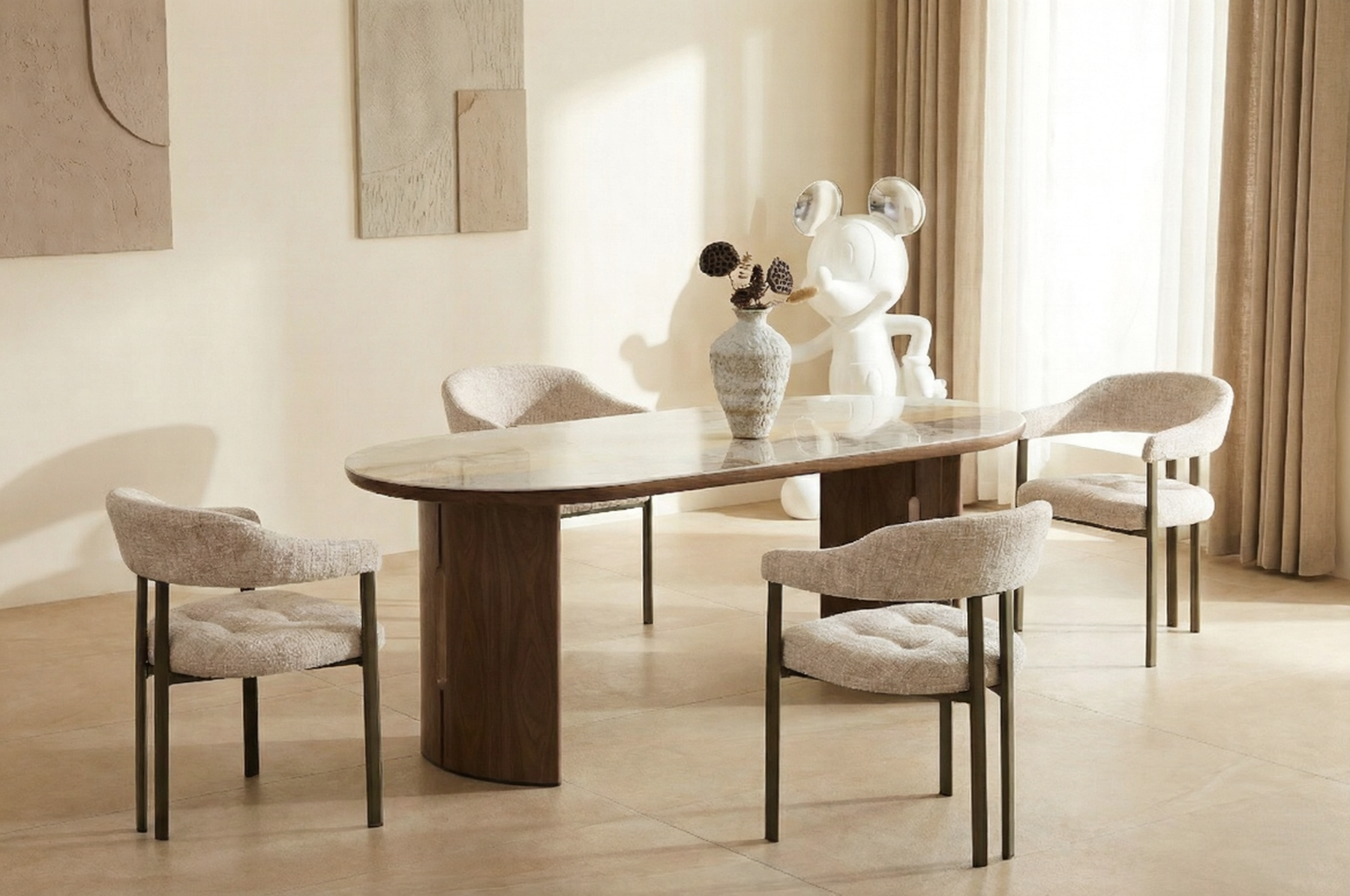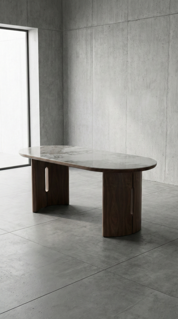 דגם ZENITH: שולחן אוכל אובלי בגימור עץ ואבן אמנותית